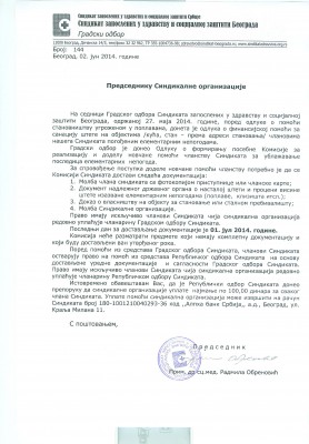 Na sednici Gradskog odbora Sindikata zaposlenih u zdravstvu i socijalnoj zaštiti Beograda, održanoj 27.05.2014. godine, formirana je Komisija za realizaciju i dodelu novčane pomoći članovima Sindikata za ublažavanje posledica elementarnih nepogoda.